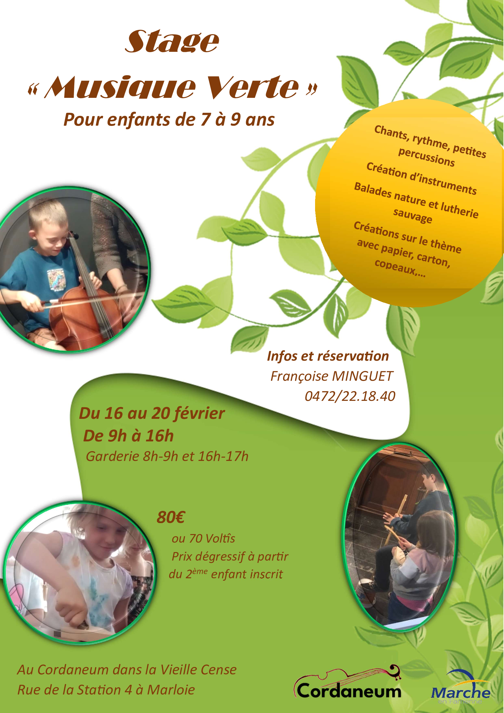 Pendant les vacances de février, le Cordaneum, situé au cœur de la Vieille Cense à Marloie, propose un stage original et créatif destiné aux enfants de 7 à 9 ans : le stage « Musique Verte ».